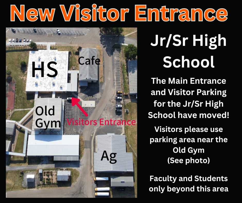 The North Entrance, Front Parking Area and Front Entrance for the Junior-Senior High School are closed. Please use the South Entrance to enter the campus. Visitors may park in the area near the Old Gym.
